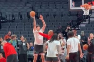 加油!杨瀚森赛前热身时练习近筐终结和中投