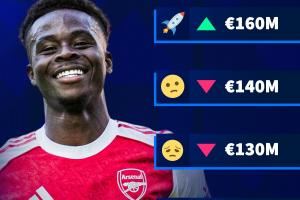 涨还是跌?德转预热萨卡身价变动:最低1.2亿欧🧊最高1.6亿🔥